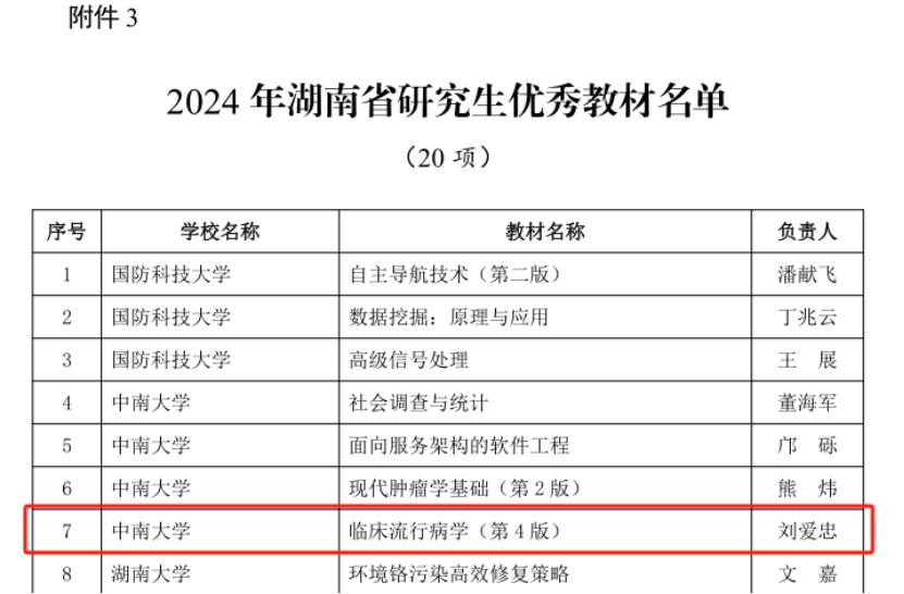 2024年12月31日,湖南省教育厅印发了《湖南省教育厅关于公布 2024年湖南省研究生精品示范课程、教学改革等项目立项名单的通知》(湘教通〔2024〕274号)文件,公布了2024年湖南省研究生精品示范课程、课程思政示范课程、研究生优秀教材、专业学位研究生优秀教学案例、学位与研究生教学改革研究立项不资助项目、研究生科研创新立项不资助项目的评审结果。我院党委书记雷先阳获湖南省学位与研究生教学改革研究项目1项、黄瑞雪教授获湖南省课程思政示范课程1项、李广迪教授获湖南省专业学位研究生优秀教学案例1项、刘爱忠教授获湖南省研究生优秀教材1项。