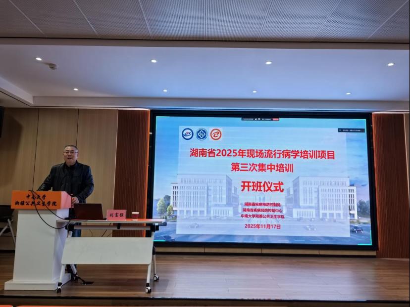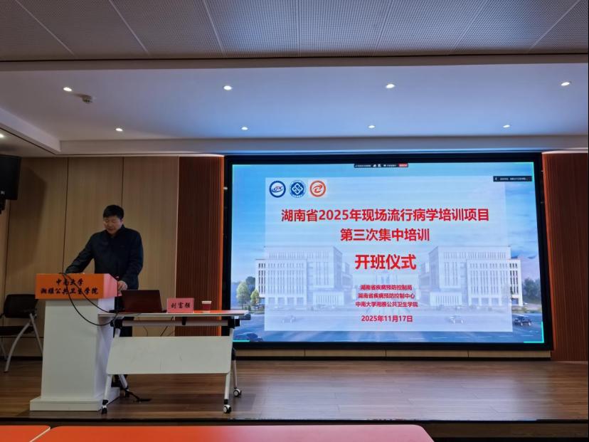 2025年11月17日,湖南省2025年现场流行病学培训项目(简称“湖南FETP”)第三次集中培训开班仪式在伟德bv1946官网举行。本次培训标志着为期7个月的培养周期进入总结提升与成果检验的关键阶段,60名学员将通过系统集训冲刺结业考核,为基层疫情防控与现场处置筑牢人才根基。